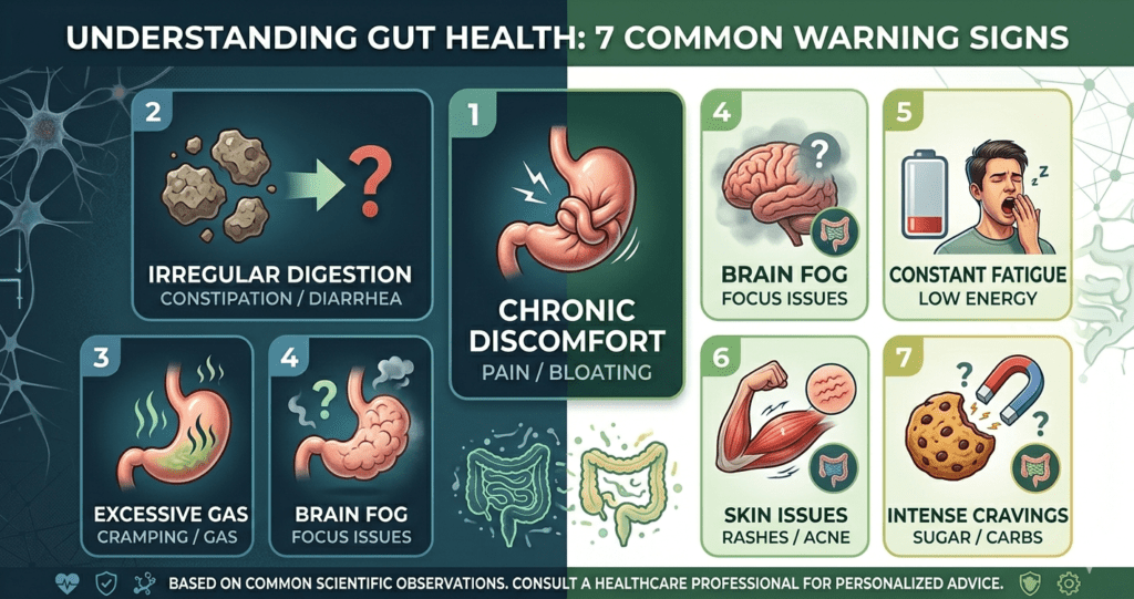 Prompt: Clean infographic listing 7 gut health warning signs with icons and minimal text