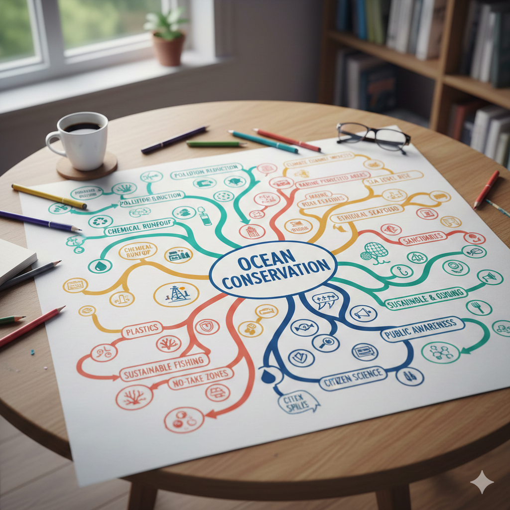 βMind map of a subject with colorful branches, keywords, and icons, top view study tableβ