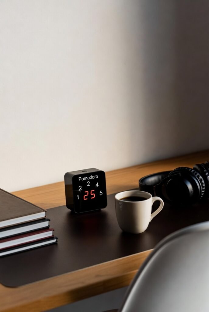 βMinimalist Pomodoro study timer with books, coffee, and headphones on aesthetic desk setupβ