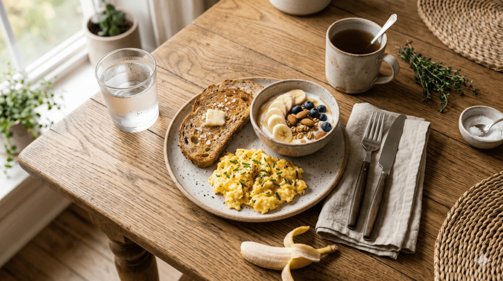 • Greek yogurt with banana and oats (probiotic + fibre + natural sugar)